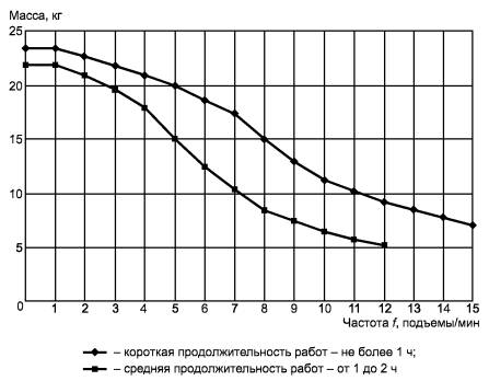 Графики (см. рисунок 2) предельных значений массы груза в зависимости от частоты поднятия для повторяющихся работ при их продолжительности в течение рабочего дня: не более одного часа и от одного до двух часов показывают, что при массе груза 7 кг и частоте15 поднятий в минуту общая продолжительность грузоподъемных работ не должна превышать 1 ч в день.