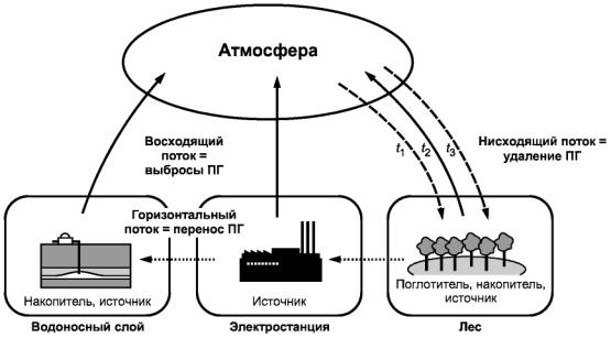 2.4 накопитель парниковых газов (greenhouse gas reservoir): Материальный объект или составляющая биосферы, геосферы или гидросферы, обладающие способностью сохранять или накапливать ПГ, удаленный из атмосферы с помощью поглотителя парниковых газов (2.3) или ПГ, поглощенный из источника парниковых газов (2.2).