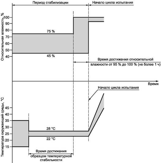 После стабилизации в испытательной камере с находящимися образцами значение относительной влажности должно быть повышено до значения не менее 95 % RH* при температуре окружающей среды 25 °С ± 3 К.