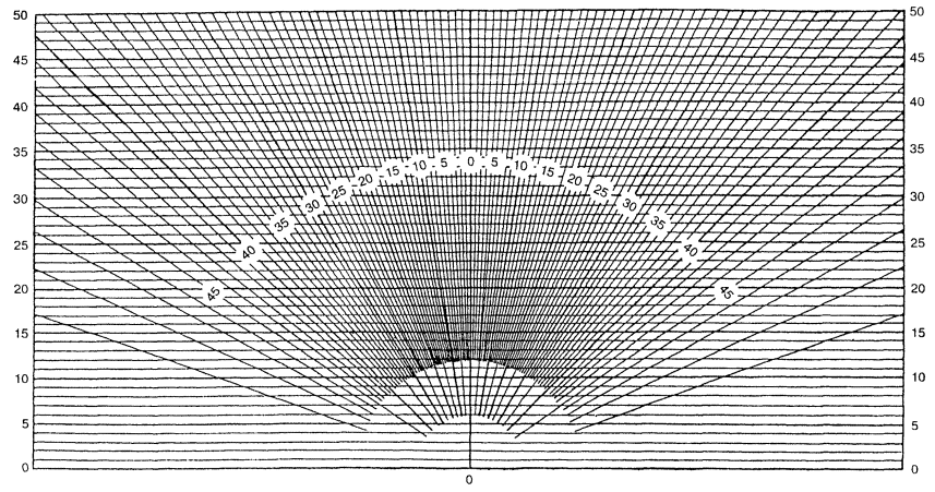 График I приложения 9 накладываем на чертеж поперечного разреза помещения (см. рис. 2 данного приложения). Центр графика «0» совмещаем с расчетной точкой, а нижнюю линию - со следом (у.р.п.). Количество лучей, проходящих от небосвода в расчетную точку, составляет n1 = 3.