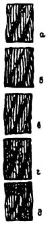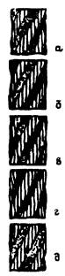 а - небольшие лыски на проволоках; б - увеличенная длина лысок на отдельных проволоках; в - удлинение лысок в отдельных проволоках при заметном уменьшении диаметра проволок; г- лыски на всех проволоках, уменьшение диаметра каната; д - интенсивный износ всех наружных проволок каната (уменьшение диаметра проволок на 40%)