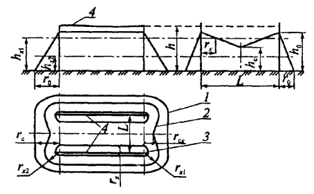1, 2 - заземлители вторичного воздействия и молниеотвода соответственно; 3, 4 - границы зон защиты на уровнях высоты защищенного сооружения и земли соответственно
