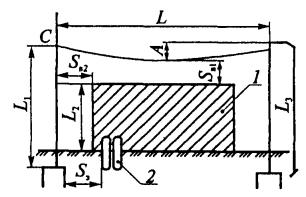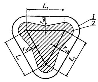 L1, L2, L3 - расстояния между молниеотводами; 1, 2 - граница зон защиты на уровнях земли и высоты защищаемого сооружения соответственно