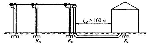 Рис. 17 (к п. 11.12). Схема измерения сопротивления заземлителей способом трех измерений
