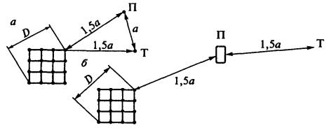 Рис. 16 (к п. 11.11). Двухлучевая (а) и однолучевая (б) схемы расположения электродов при измерении сопротивлений сложных заземлений и одиночных горизонтальных полос: