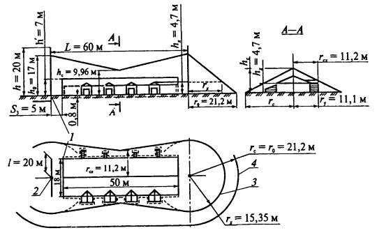 Рис. 18 (к п. 11.14). Схема к примеру расчета молниезащиты хранилища взрывчатых материалов: