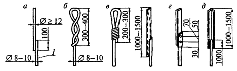 Рис. 14 (к п. 8.1.5). Конструкции молниеприемников из круглой стали (а, б), стальной трубы (в), полосовой стали (г), угловой стали (д):