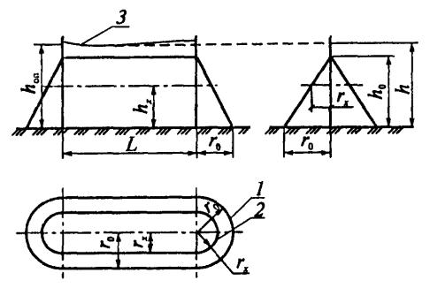 1, 2 - границы зон защиты на уровне земли и высоты защищаемого сооружения соответственно; 3 - трос
