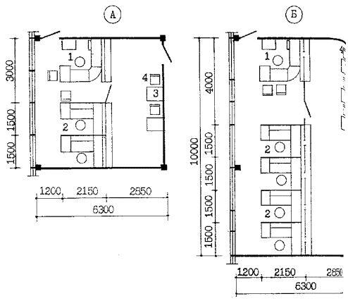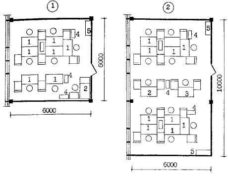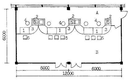 Бюро пропусков (рис. 6.3 и 6.4), располагается, как правило, вблизи главного входа на границе с доконтрольной зоной (аванвестибюлем). Количество рабочих мест в бюро пропусков определяется заданием на проектирование. Площадь на одно место принимается не менее 4 м2. Конструкции, отделяющие бюро пропусков от аванвестибюля должны быть устойчивы к взлому. Класс устойчивости определяется заданием на проектирование. Это требование относится также к наружным стенам и окнам, если они имеются в помещении сотрудников бюро пропусков.