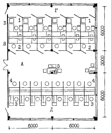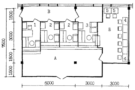 А - операционный и кассовый залы размещаются на одном (первом этаже); они могут располагаться по обе стороны от вестибюля или холла, или смежно в глубине здания за вестибюлем (в этом случае наиболее рациональна организация единого операционно-кассового зала);