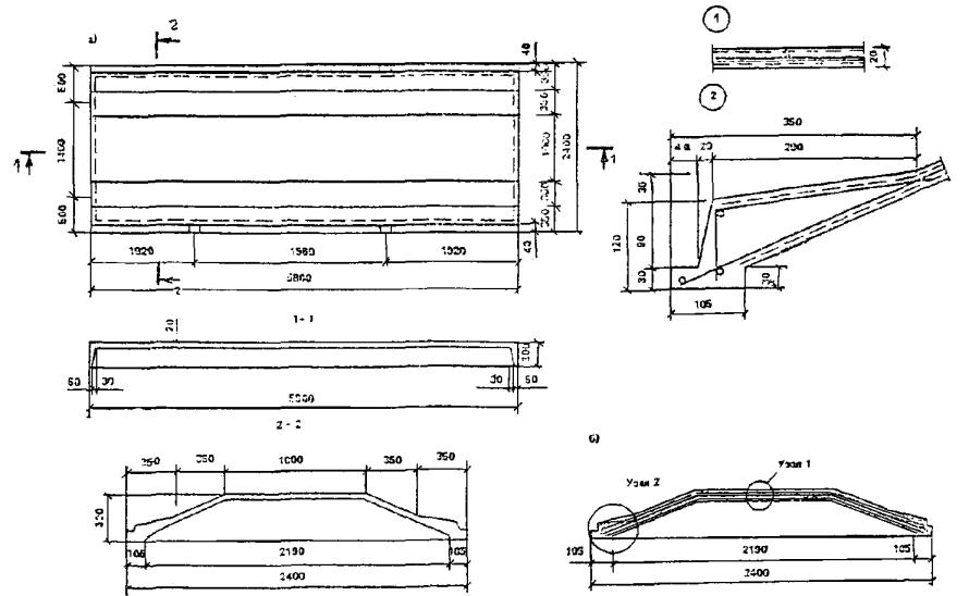 Плита-складкаимеет форму и размеры: длина 5,8 м, ширина 2,4 м, высота 0,3 м,толщина оболочки 20 мм, угол наклона боковых граней около 23°.