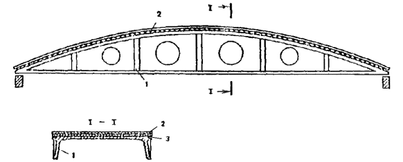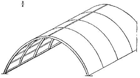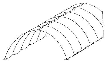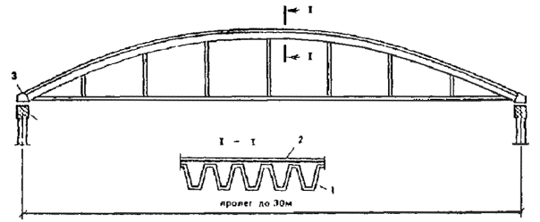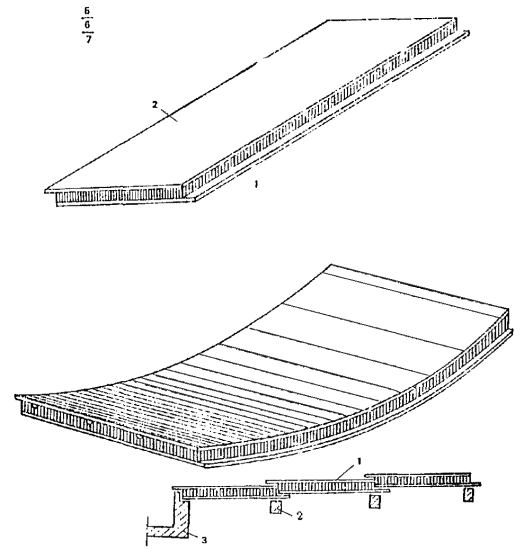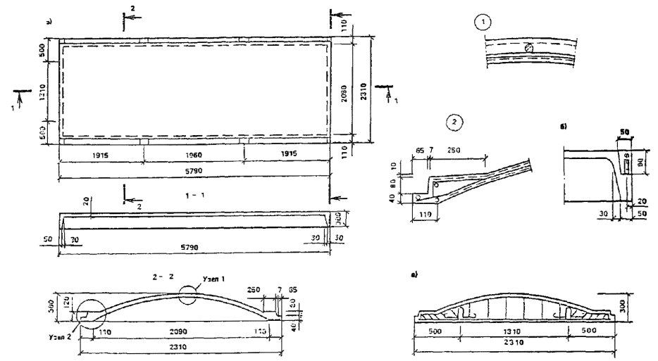 1.16.Для сводчатых конструкций массового строительства целесообразно предусматриватьэлементы двоякой кривизны (рис. 2) или цилиндрические ребристые элементы (рис. 3)шириной 2 - 3 м, длиной до 24 м и толщиной 2 - 3 см. Из элементов двоякойкривизны могут собираться волнистые своды пролетом до 48 м.