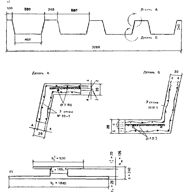 Дляармирования полки панелей применяется тканая сетка № 10-1 (ГОСТ3826-82*); продольные ребра армируются плоскими сварными каркасами из сталикласса А-III(для продольных стержней) и класса В-I (для поперечных стержней); поперечные ребра армируютсяотдельными стержнями из стали класса В-I.