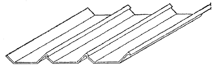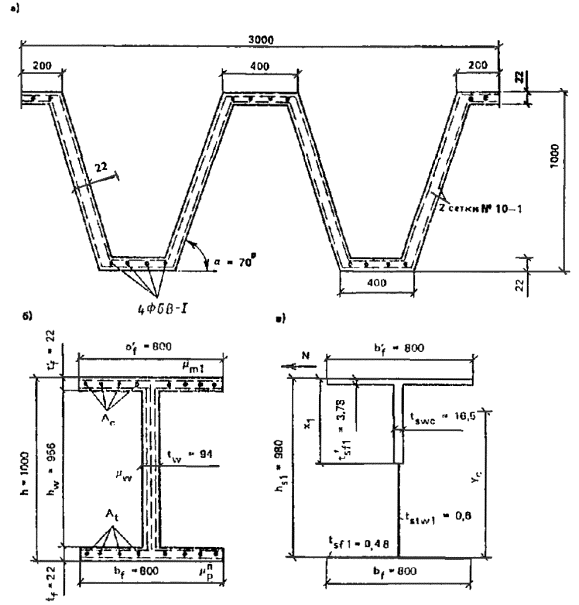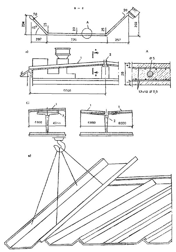 1.17.Складчатые элементы шириной 1 - 1,5 м, длиной до 8 м, толщиной до 25 ммприменяются для покрытия с соединениями швом внахлестку (рис. 4).Складки изготавливаются методом сгиба свежеотформованного листа, имеюткомбинированное армирование сетками и продольными проволоками из стержнейкласса Вр-Iдиаметром 5 - 6 мм с монтажным (при длине складок до 3 м) или расчетнымпредварительным напряжением. Складки могут применяться для крыш жилых зданий счердаком, для павильонов и навесов без рулонной гидроизоляции и в качествеэлементов стен неотапливаемых зданий и павильонов.