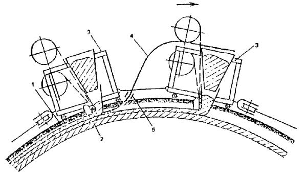 1 - рельсыформовочного поста; 2 - форма, 3 - формовочные тележки; 4 - стержневая арматура; 5 - распределительная планка