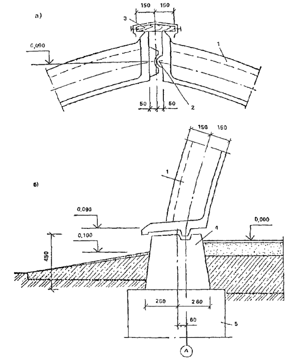 а - стык элементов в шелыге свода; б - стыкэлемента свода с фундаментной балкой; 1 - армоцементный элемент свода; 2- бетонный шарнир на диафрагме; 3- деревянный нащельник; 4- фундаментная балка; 5 – фундамент