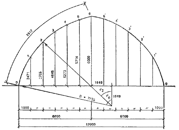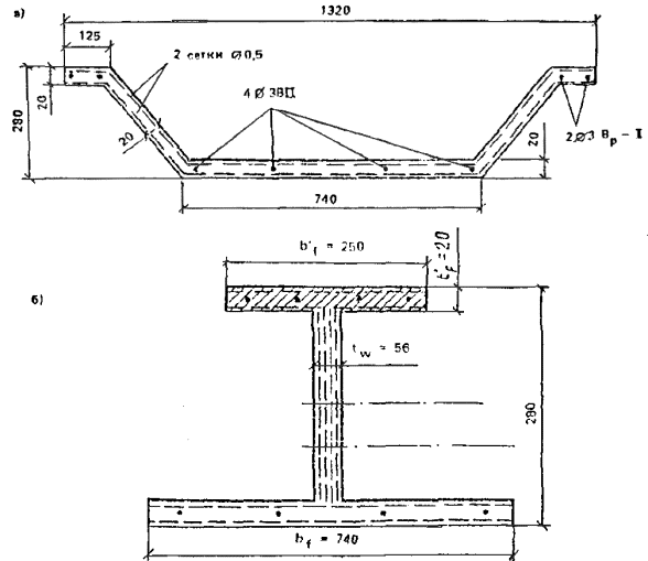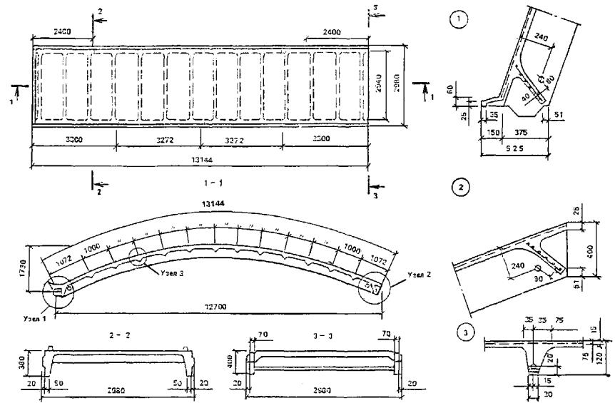 Элементысборного свода пролетом 40 м имеют длину 13,9 м. В продольном направлениинейтральная ось элемента представляет дугу с радиусом 28,9 м. В поперечномсечении элемент имеет ширину 1,98 м, высоту сечения 0,5 м и стержневоеармирование. Поперечная арматура состоит из 92 стержней с шагом 0,15 мм.