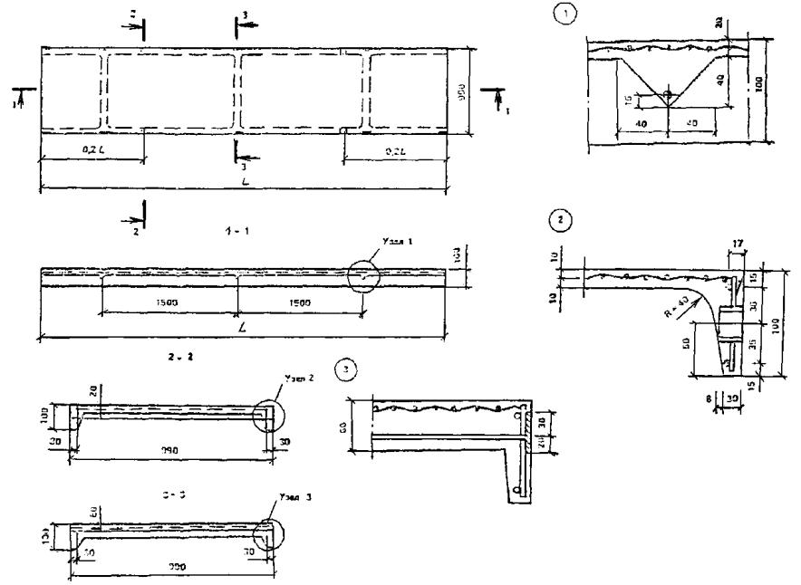 Трехграннаяскладчатая плита подвесных потолков (рис. 2) более удобна для прохода поним в устройства световых проемов. Средняя горизонтальная грань плиты-складкиимеет ширину 1 м. Опалубочные размеры плиты приняты в соответствии стехнологическими требованиями изготовления виброштампованием.