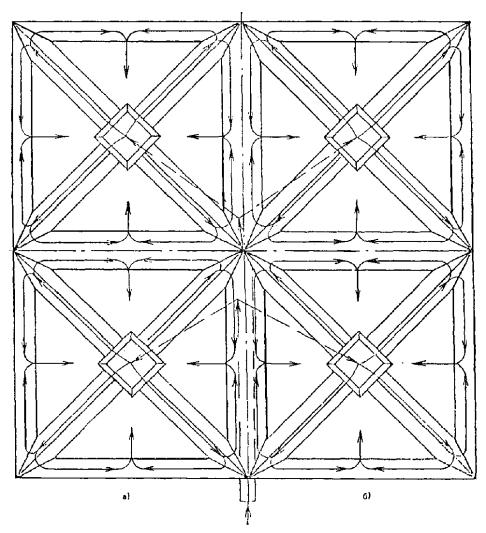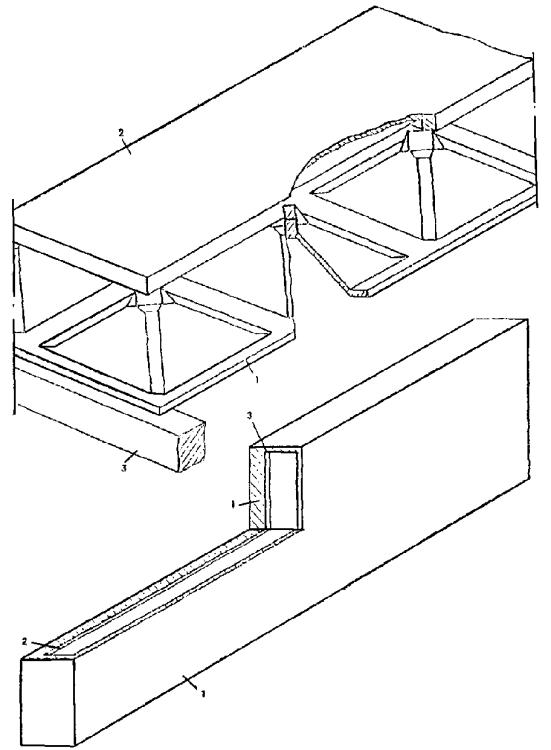 1.21. Армоцементныепирамидальные элементы структуры (рис. 11) применяются для перекрытийи покрытий над зальными помещениями пролетом до 24 м. Армоцементные пирамидыразмером до 1,5 ´ 1,5 м объединяются на заводе в блоки,например размером 3 ´ 9 м, из которых собираются с помощьюсварки элементы балочного покрытия на пролет. В этих элементах может бытьприменена предварительно напряженная арматура. Армоцементные структурные плитыпокрытия опираются на подстропильные балки, на колонны или на стены.