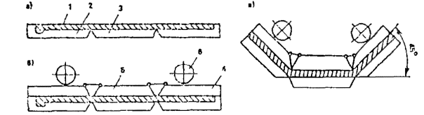 а - отформованиеплоского листа на листогибочном поддоне; б - установка вкладыша-пригруза; в - сгиб листа до складки; 1 - армоцементный лист; 2- поворотная плоскость поддона; 3- неподвижная плоскость поддона; 4 - поворотная плоскостьвкладыша; 5 - неподвижная плоскость вкладыша; 6 - вибратор вкладыша