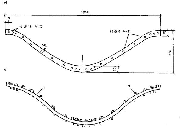 а - расположениестержневой арматуры в армоцементных элементах волнистых сводов; б - схема фиксации продольнойарматуры; 1 - элемент свода; 2 - поперечная арматура Æ 6 А-III