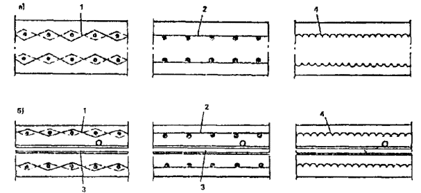 а - сетчатое; б- комбинированное; 1 - частые тонкие тканые сетки; 2 - частыетонкие сварные сетки; 3 - стержневая или проволочная арматура; 4- сетки плетеные