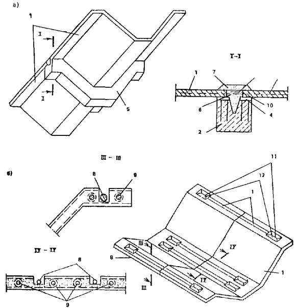 Вибропрогибможет выполняться также с помощью шарнирного вибровкладыша (см. рис. 11),который укладывается на отформованный армоцементный лист перед погибом.Вибровкладыш должен быть утепленным, плотно уложенным на поверхность бетона.Вкладыш снимается после окончания термообработки. Рабочую поверхностьвибровкладыша следует покрыть полимерным составом.