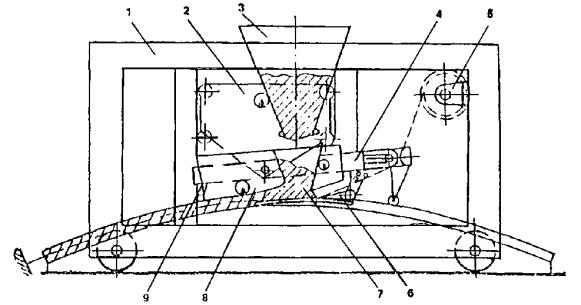 1 - портал; 2 - вертикально-подвижная каретка;3 - бункер накопитель; 4 - натяжной механизм; 5 -рулонодержатель; 6 -фиксатор армирующей сетки; 7 - вибробункер; 8 - скользящий виброштамп; 9 - тележка рабочего органа