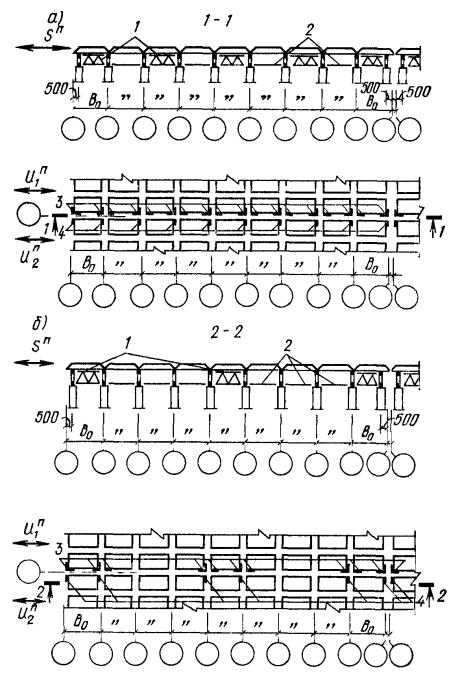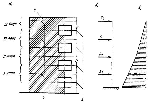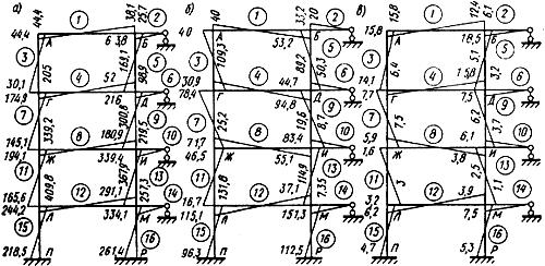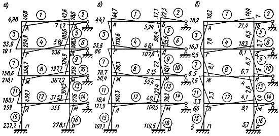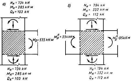 Согласно указанию п. 5.36 расчетные усилия в простенке и горизонтальных поясах от действия сейсмической нагрузки определяем исходя из допущения, что нулевые точки моментов располагаются по вертикали в середине расстояния между осями горизонтальных поясов, а по горизонтали симметрично относительно вертикальных осей проемов. Эпюры изгибающих моментов изображены на рис. 149, б.