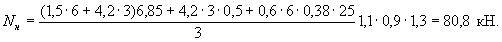 Nн = (6,85·6·1,5+25·0,6·6·0,38)1,1·0,9·1,3 = 123 кН (при действии вертикальной сейсмической нагрузки вниз);