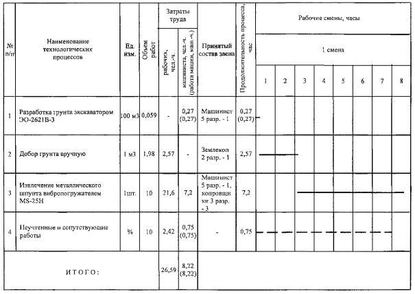 6.1 Трудоемкость выполнения работ по извлечению металлического шпунтавибропогружателем MS-25H, характеризующая использование материально-технических и трудовыхресурсов, определена в калькуляции трудовых затрат и машинного времени по«Единым нормам и расценкам на строительные, монтажные и ремонтно-строительныеработы» и приведена в таблице 7.