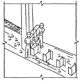 2.5 Машинист экскаватора ЭО-2621В-3 с жесткой подвеской рабочегооборудования на базе трактора МТЗ-50 откапывает шпунт при необходимости слева исправа на всей длине шпунтовой стенки, на глубину не менее 0,3 м, отсыпая грунтпо обе стороны от нее. Землекоп, находясь от экскаватора на безопасномрасстоянии, равном радиусу действия экскаватора плюс 5 м, осуществляетподчистку грунта лопатой около шпунтин и балок, отбрасывая его в сторону, какпоказано на рисунке 4. Ширина откапываемого котлована определяется габаритами ковша иразмерами шпунта.