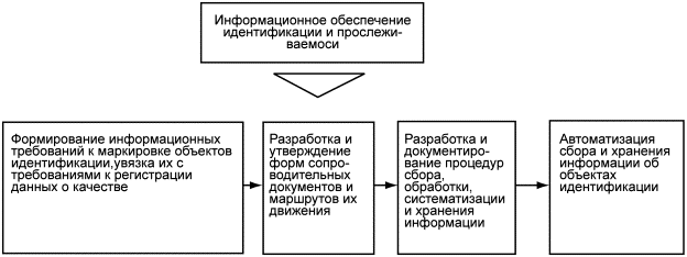 6.1.Информационное обеспечение идентификации и прослеживаемости включает в себяразработку и внедрение информационных форм (сопроводительных документов идругих носителей), схем информационных потоков и точек регистрации информации,а также процедур обработки, систематизации, хранения и реализации данных обобъектах идентификации, включая машинные способы обработки информации. Составработ по информационному обеспечению приведен на рисунке 2.