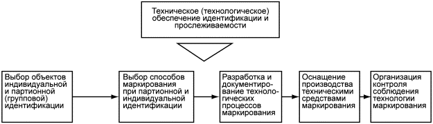 5.1.Комплекс работ по техническому (технологическому) обеспечению идентификаций ипрослеживаемости на предприятии включает разработку технологии маркированияприменительно к конкретным объектам идентификации, внедрение и поддержание вуправляемых условиях технических средств и процессов маркирования. Состав задачтехнического обеспечения приведен на рисунке 1.