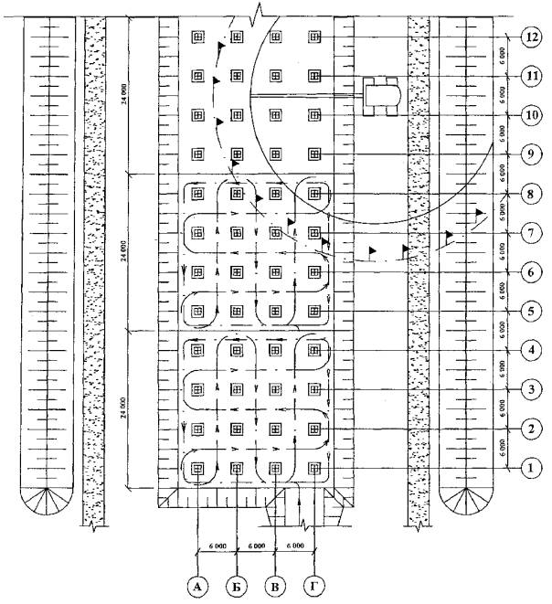 2.5 Организация работ по уплотнению грунта обратных засыпок фундаментов здания ссеткой колонн 6,0´6,0 м представлена на рисунке 1,где поочередно по захваткам, длина которых принята по 24 м, производятся работыпо устройству обратной засыпки, разравниванию и уплотнению грунта.