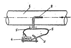 1 -воздуховод нагнетательный или всасывающий, 2 - пневмометрическая трубка, 3.-наклонная трубка микроманометра, 4 - резервуар микроманометра, 5 - резиновыешланги.