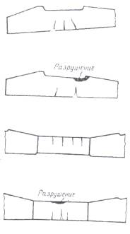 | 12.1. | Первая | Поперечные трещины с раскрытием до | Неправильное опирание шпал на балласт после укладки звеньев, очистки щебеночной призмы или в результате длительного отсутствия выправки пути в эксплуатации: опирание шпал серединой или, наоборот, только концами при провисшей вниз на большой длине середине шпалы (трещины снизу) | Провести сплошную выправку и подъемку пути с подбивкой шпал по всей длине подрельсовых частей. Устранить провисание середины шпал. Засыпать шпальные ящики балластом. Проверить планирующие устройства у путевых машин для исключения подпора шпал в середине. | |