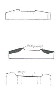 | 41.1 | Первая | Множество раковин на поверхности бетона. Начальное разрушение бетона (шелушение) в пределах толщины защитного слоя бетона над арматурой | Недостаточные морозостойкость и долговечность бетона вследствие использования непригодных для шпального бетона исходных материалов, неправильного подбора состава бетонной смеси и плохого уплотнения ее при изготовлении шпал | При обнаружении дефекта в период действия гарантийного срока предъявить претензию изготовителю шпал. Установить особое наблюдение за дефектными шпалами при осмотрах пути | |