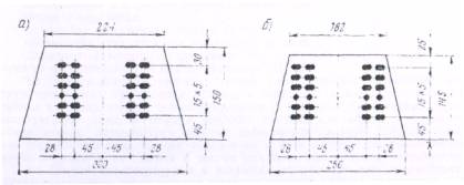 По согласованию изготовителя спотребителем допускается изготовлять шпалы, у которых расположение и размерыуглублений на подошве отличаются от указанных на рис. 1, а форма и размерывертикальных каналов для закладных болтов отличаются от указанных на рис.2-4.