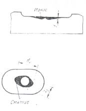 | 32.1 | Первая | Околы бетона на ребрах и плоскостях шпалы (кроме упорных кромок) глубиной (h) не более | Удары по шпалам при их транспортировании, погрузке, выгрузке, сборке и укладке звеньев, выполнении путевых работ, падении на путь тяжелых предметов. Местные перенапряжения бетонных кромок шпал при опирании их на опоры с очень малой поверхностью контакта | При наличии шпалоремонтных мастерских околы бетона могут быть заделаны полимерцементными растворами и отремонтированные шпалы использованы в малодеятельных главных или станционных путях | |