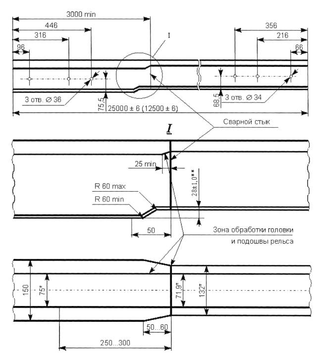 На кромках болтовых отверстийи в торцах по всему сечению рельса должна быть снята фаска размером 1-