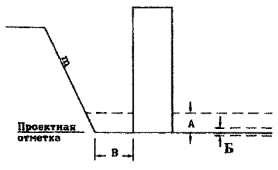 Отклонения отметок дна выемок в местах устройства фундаментов и укладки конструкций при окончательной разработке или после доработки недоборов и восполнения переборов ("Б") |