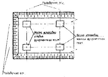 К разбивке осей необходимо приступать после проверки расстояний между отдельными осями с общим размером здания.