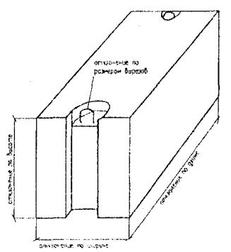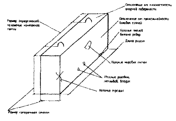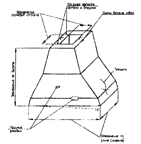 3. На поверхности фундамента не допускаются (рис. 1): раковины диаметром более 15 мм и глубиной более 5 мм; околы бетона ребер глубиной более 10 мм и общей длиной более 100 мм на 1 м ребра; местные наплывы бетона и впадины высотой и глубиной более 5 мм; трещины, за исключением усадочных трещин не более 0,1 мм; обнажение арматуры.