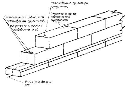 Наружные и внутренние грани блоков следует фиксировать натянутыми шнурами или тонкой проволокой, по которой размечают проектное положение каждого блока.