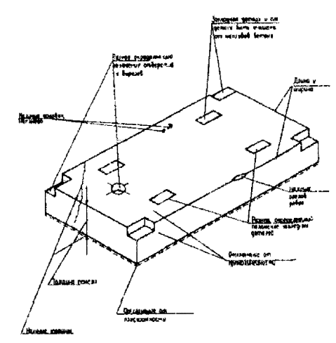 Перед подъемом каждой плиты необходимо проверить: соответствие ее проектной марке, состояние закладных изделий и установочных рисок, отсутствие грязи, снега, наледи, повреждений грунтовки. Запрещается подъем плит, не имеющих монтажных петель или меток, обеспечивающих их правильную строповку и монтаж.