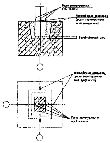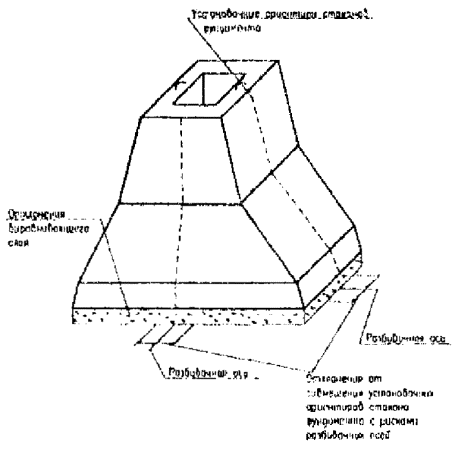 1. Установка блоков фундаментов стаканного типа производится относительно разбивочных осей по двум взаимно перпендикулярным направлениям, с совмещением осевых рисок фундаментов с ориентирами, закрепленными в основании, и контролем правильности установки геодезическими приборами.