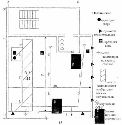 14. Если в помещениях нет возможностиобеспечить безопасные расстояния от боевой позиции ствольщика доэлектроустановок с применением в качестве огнетушащего средства распыленнойводы, тушение пожара производится одним из следующих способов: