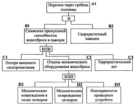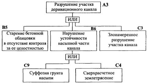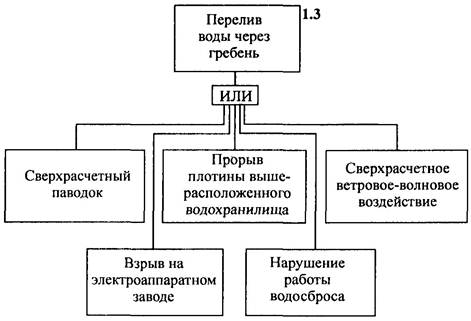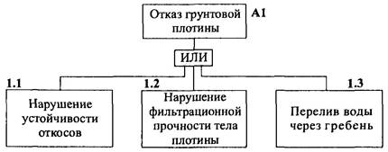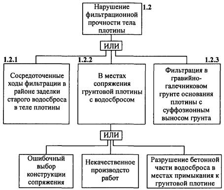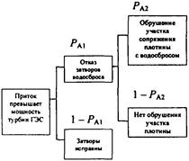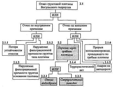 Здесь Рi.j, Рi.j.k - среднегодовые вероятности реализации событий -элементов «дерева отказов»; при этом значения р2.1.1, р2.1.2, р2.1.3 определяются расчетным путем по методике R. Fell, рекомендованной «Методическими указаниями по проведению анализа риска аварий гидротехнических сооружений» [22] для грунтовых плотин и дамб, значения р2.1.4, р2.1.5, р2.1.6, р2.2.1 - по литературным данным, значение р2.2.2 - по гидрологическим данным проекта сооружений, значения р2.1 и р2.2 - по формулам, приведенным выше.