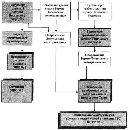 Результаты расчетов показали, что среднегодовая вероятность реализации наиболее опасного по уровню риска и последствий сценария аварии, возможного на гидротехнических сооружениях Верхне-Тагильской ГРЭС, - отказ грунтовой плотины Вогульского гидроузла (сценарий 2.1) - составляет величину